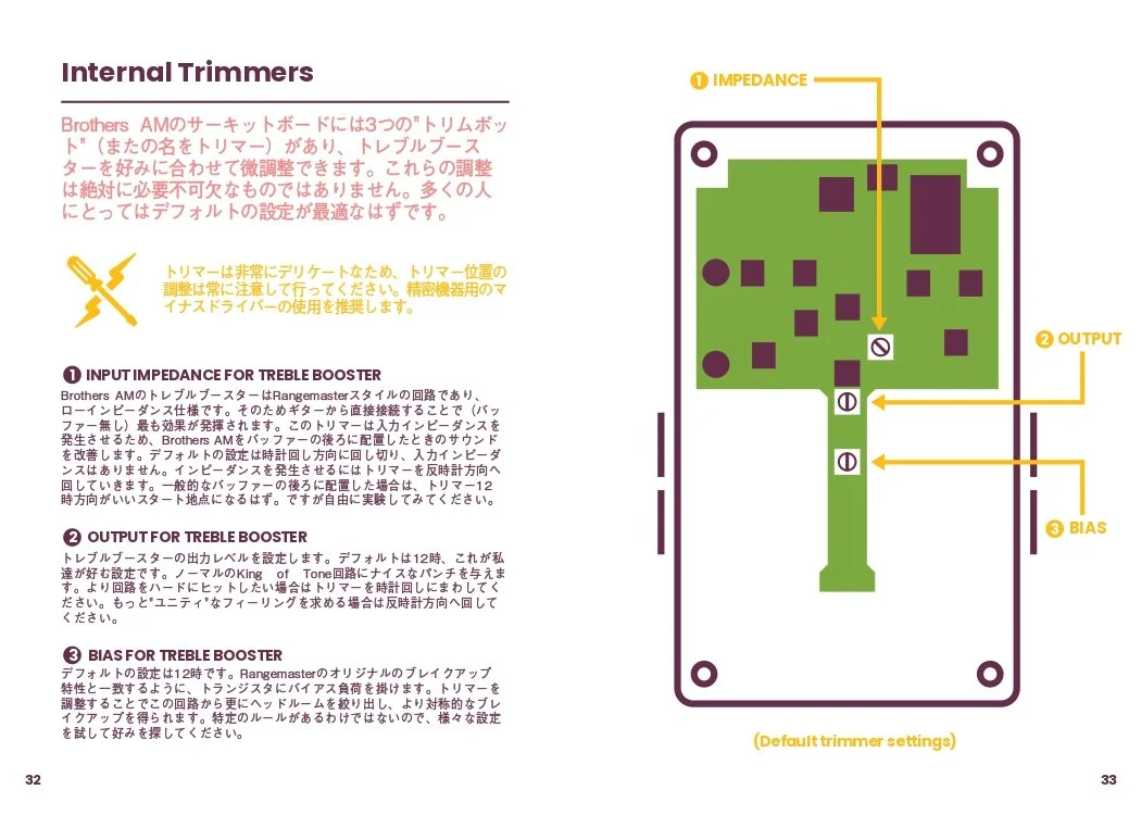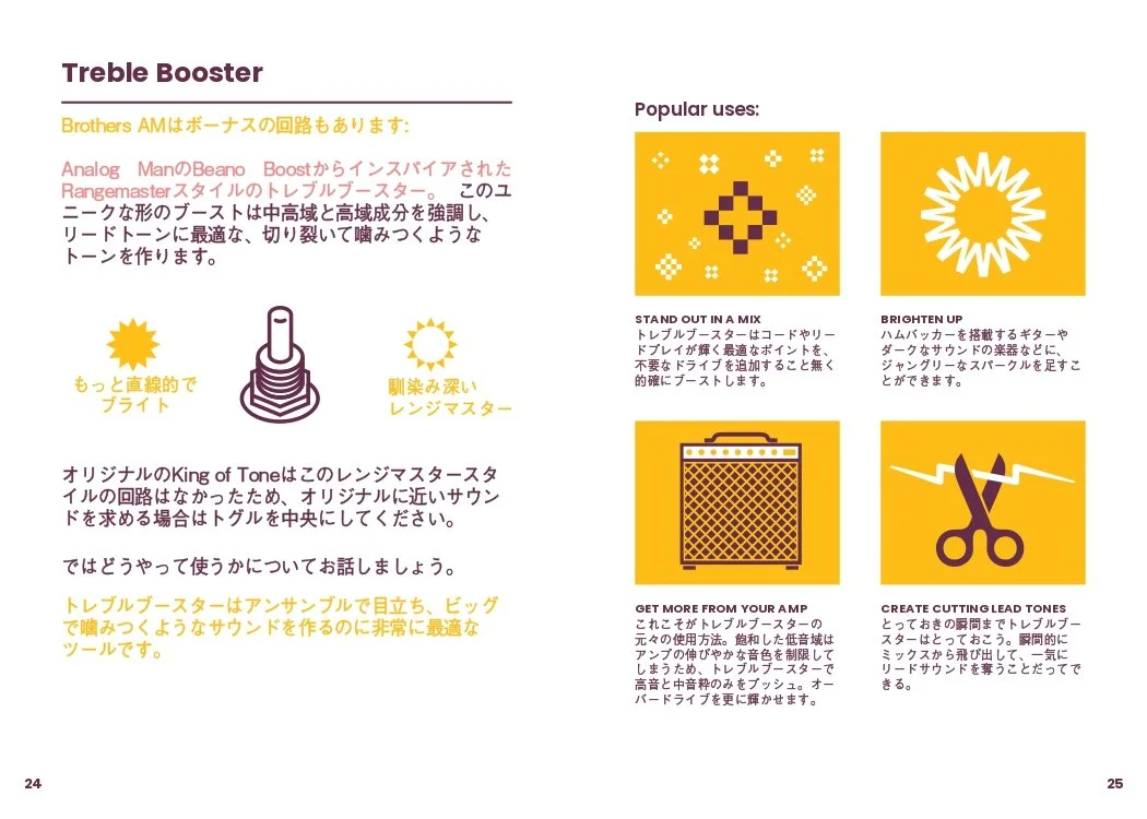 Brothers AMにはボーナスとして、Analog Man Beano Boostからインスパイアされたトレブルブースターを搭載。