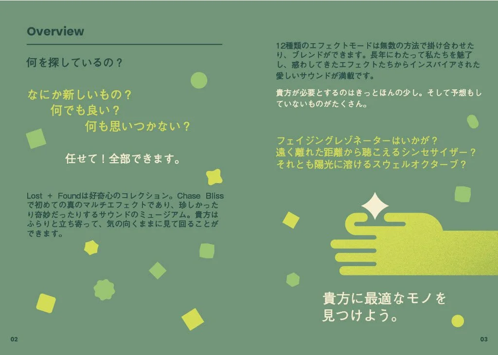 貴方の音楽に新たなエネルギーをもたらすために生まれたマルチエフェクトであり、どんな場面でもイマジネーションをくすぐる「素敵な何か」を届けます。まるで特別なスパイスの詰め合わせのように。